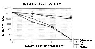 Methods: Sixty retired female breeder Sprague-Dawley rats were infected with Staphylococcus Aureus using the model by Korkusuz et al. All animals were followed radiographically and clinically for signs of infection. At 7 weeks post infection, all animals were debrided and broken into 4 treatment groups: (A) Debridment only, (B) Debridment + Daily intraperitoneal gentamycin (0.2 mg/kg/day), (C) Debridment + Gentamycin impregnated CPC in a void filled model (1.0 mg/kg), (D) Debridment + Gentamycin impregnated PMMA beads (1.0 mg/kg). Tibiae were harvested at T=0 (control) (n=6), T=3 weeks (n=3/group), T=5 weeks (n=4/group) and T=7 weeks (n=4/group) and analyzed using quantitative bacteriologic analysis expressed as CFU of bacteria per gram of bone. Statistical analysis was performed using Student's T-test.