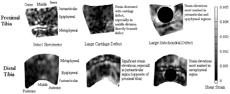 Discussion: Strain has been shown to be an important physical signal regulating functional adaptation of bone. Direct measurement of strain in bone has been limited to cortical tissue, and trabecular strain measurements have relied on finite element models. We developed texture correlation to directly measure strain in trabecular bone, eliminating structural and material assumptions inherent to finite element analysis. In the intact samples of the proximal and distal tibia, strain distribution was relatively homogenous throughout the specimens. Interestingly, cartilage defects caused sharp strain elevations in the distal tibia and diametrically opposite decreases in shear strain in the proximal tibia. Subchondral bone defects caused strain elevations in both the distal and proximal tibia but in different regions. While concentrating strain elevations in the juxtaarticular and epiphyseal regions in the proximal tibia, subchondral defects caused strain elevations in the metaphyseal region of the distal tibia.